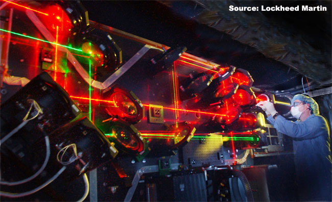engineer checks the alignment of one of the Low Energy Laser optics at the Lockheed
