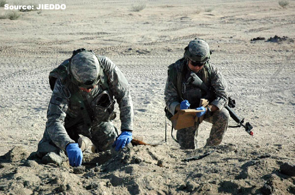 Soldiers examine evidence at a training site for improvised explosive devices